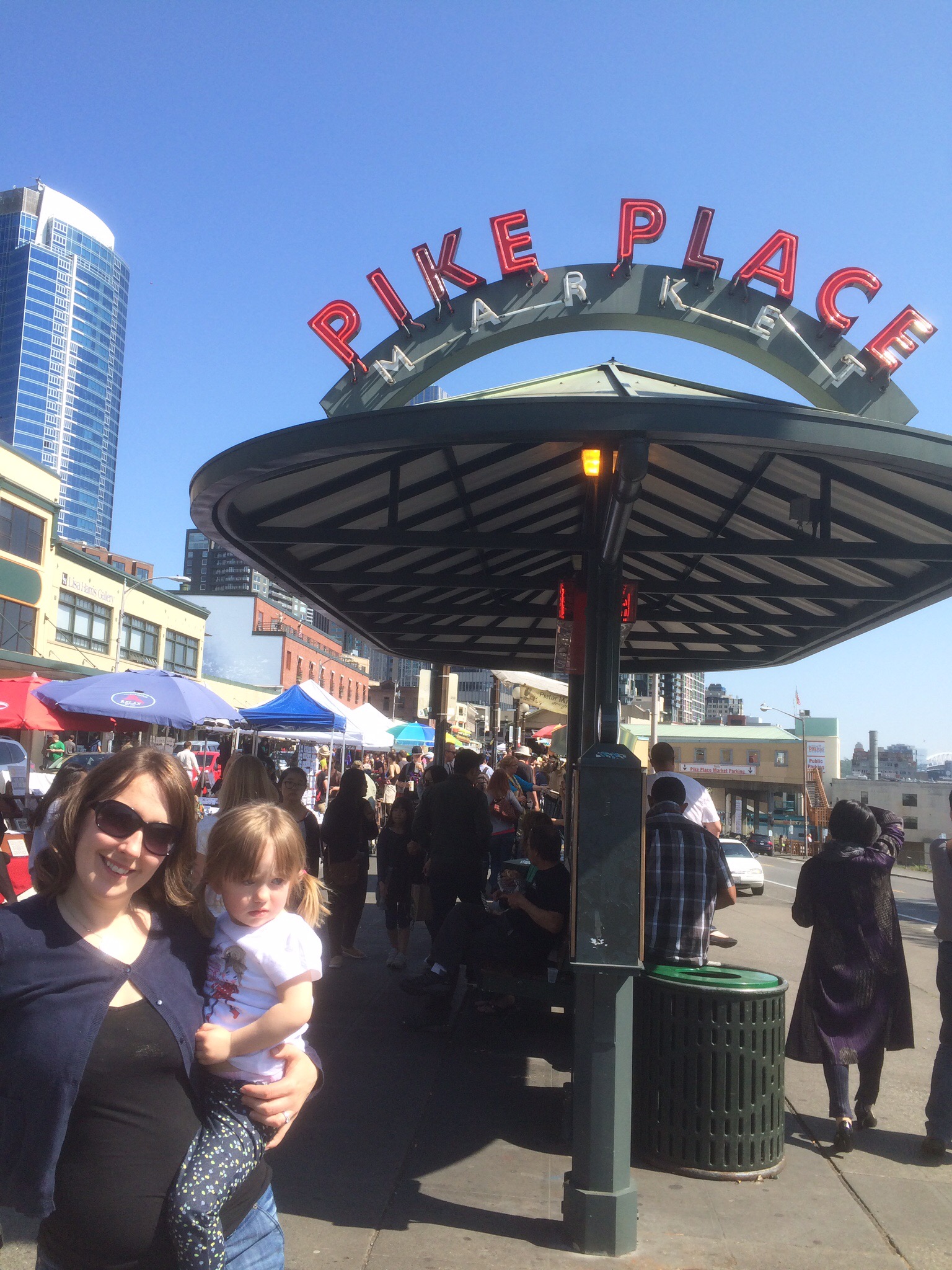 Arrived at the hotel, had a quick change and headed out into the city. The time difference meant it was around 11am when we arrived so it was going to be tough to keep going until the evening. We walked down to the waterfront and the kids both fell asleep quite quickly. We saw the Aquarium and decided to go there the next day. We bought a CityPass which included entrance to the Aquarium, a boat trip, the space needle and the science park. After the waterfront we headed up to Pike Place market. The city is really hilly which isn’t easy when your pushing a double pushchair. The market was amazing, it’s in the historical district and felt very atmospheric. Lots of fresh seafood and flowers but also stalls selling all sorts of gifts and crafts. We opted for some fish scallops and Garlic fries for me and a fish taco for David which was delicious.