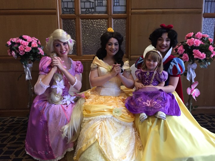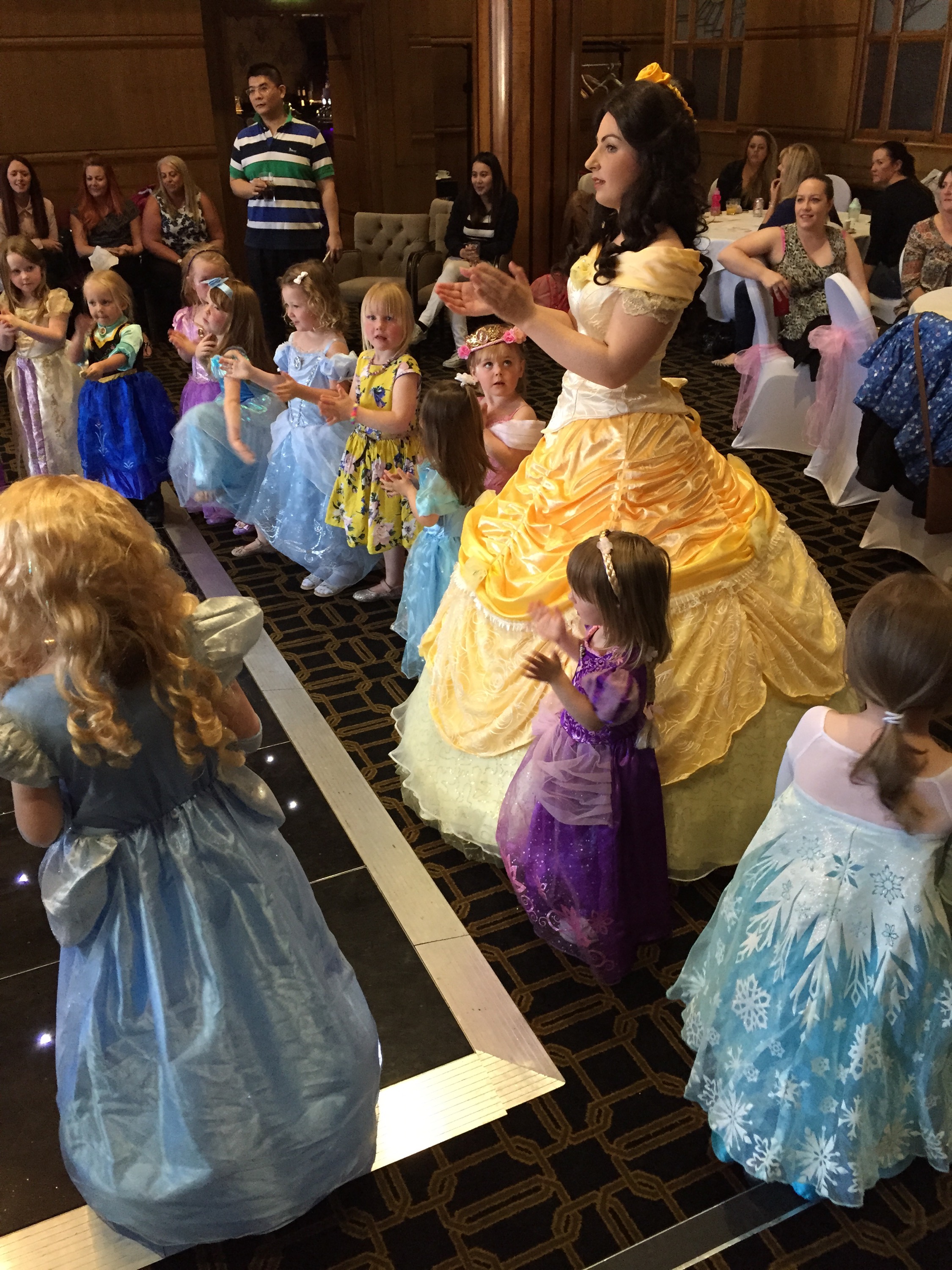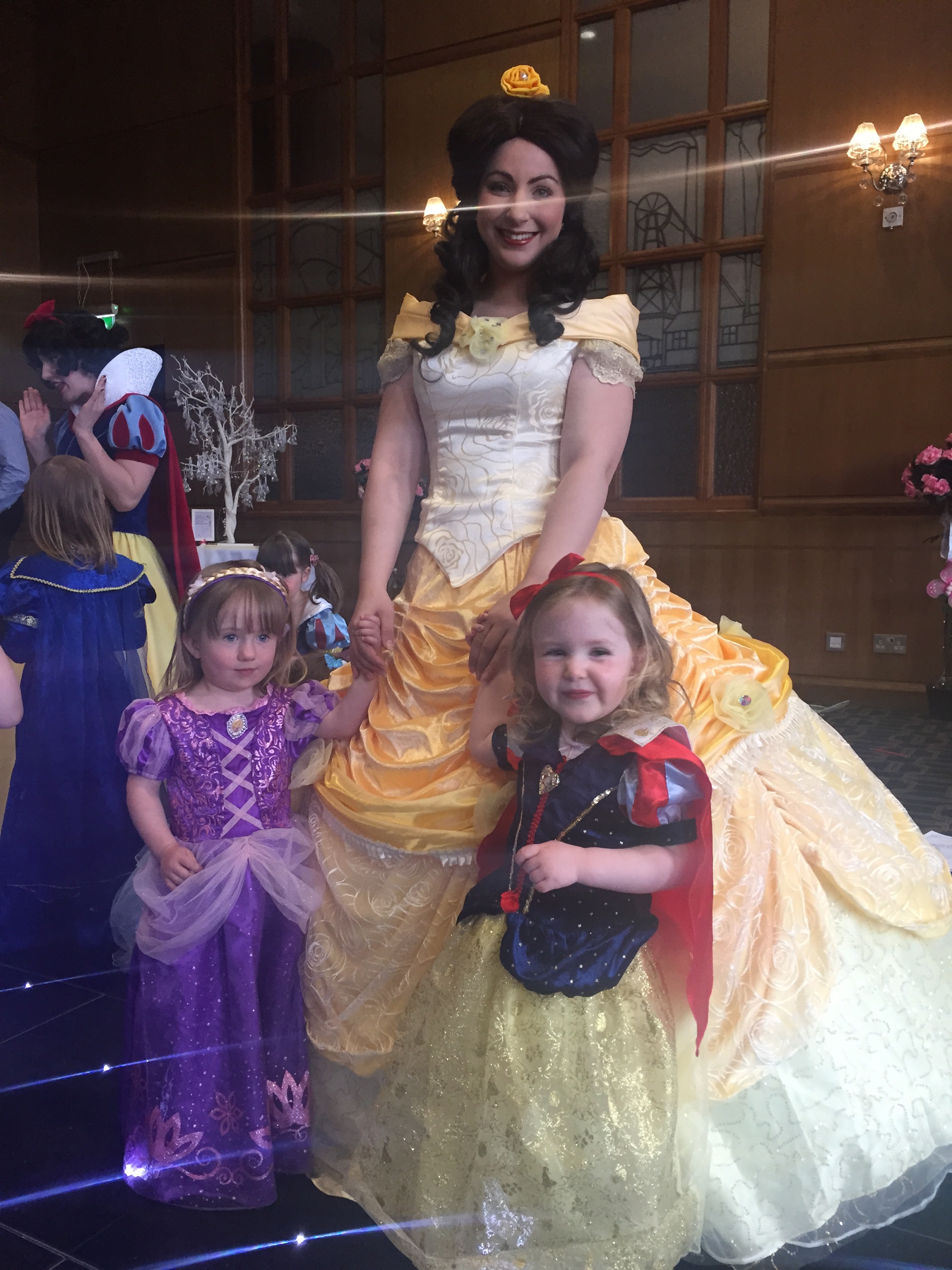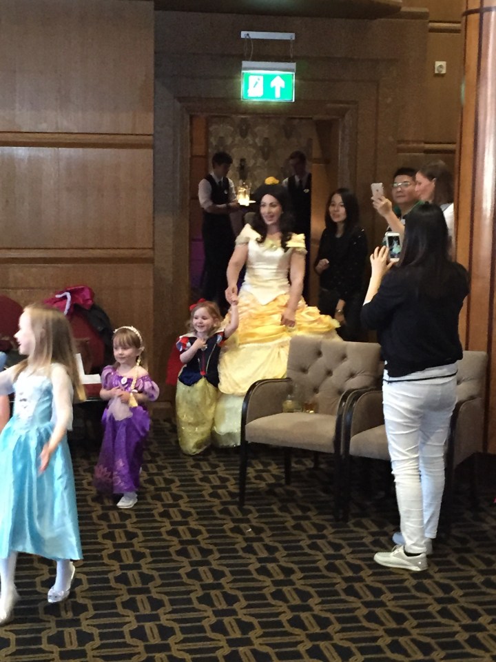 So Ava donned one of her MANY princess dresses, Rapunzel was the princess of choice today, complete with hairpiece! When we arrived we were told to make our way to the ballroom which was a lovely big room with a small stage and a twinkling dance floor. You couldn’t see very much of the dance floor however as it was covered in little girls in all their princess finery!